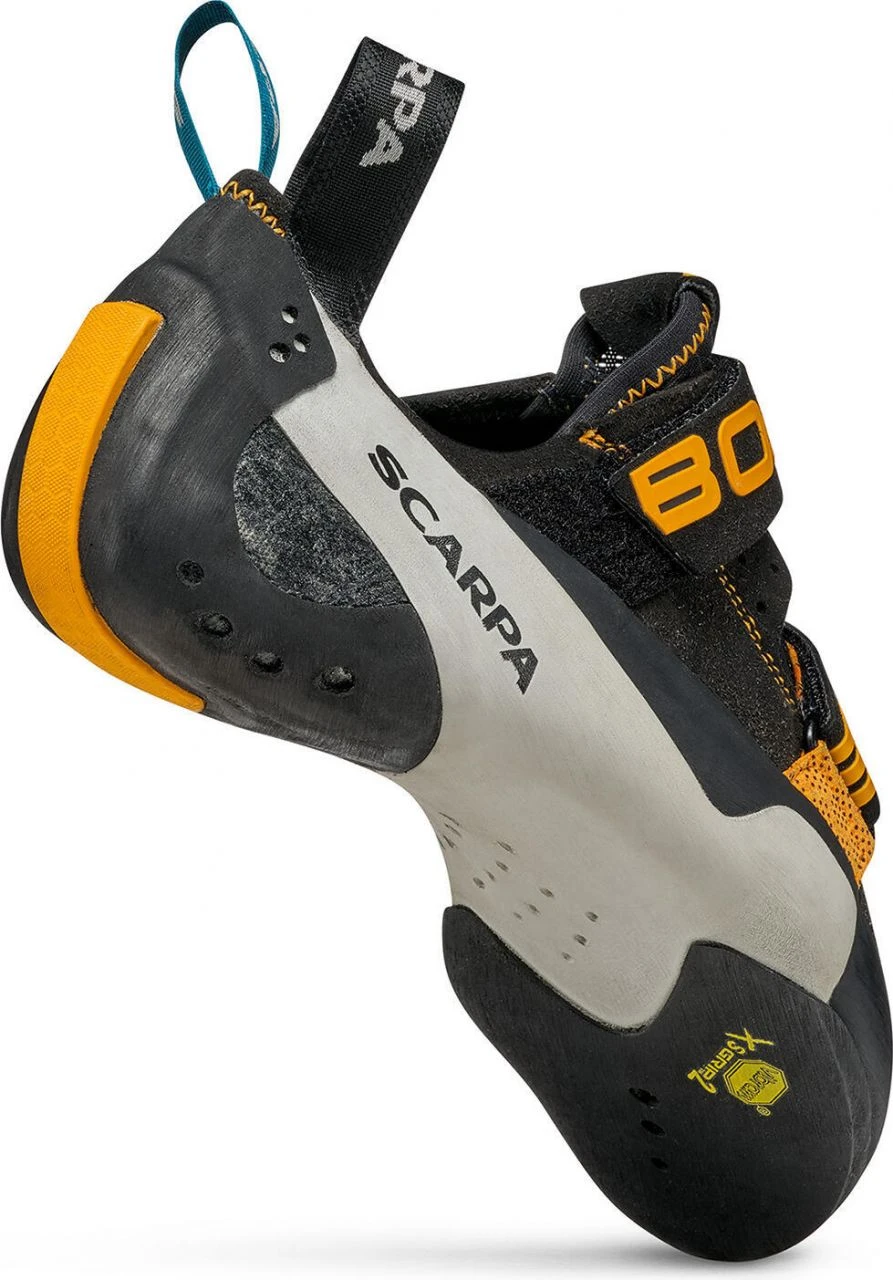 The Booster is the modern rock climbing weapon from the house SCARPA. Flexible in the midfoot area and with a supportive forefoot area, the climbing shoe is particularly suitable for rock climbing where standing on friction as well as on small edges is required. The High-End climbing shoe model is made of a microfiber upper, which is made of 6 cut parts that are sewn together so that the shape fits perfectly to the foot without causing pressure points. The midfoot receives light support from the DTS Tension system, but at the same time allows the foot to move flexibly. The midsole, a Flexan insert in the area of the big toe, supports the foot when standing small kicks and the asymmetrical shape of the shoe, as well as the downturn and the high toe box provide perfect power transmission to the big toe. The orange stripe of M50 rubber on the heel and the Toe patch in the toe box provide good hooking properties. The grippy Vibramยฎ XS Grip2 sole rubber provides excellent grip with unique edge stability. All climbers and boulderers looking for a performance climbing shoe for the rock and the hall are well advised with the Booster.