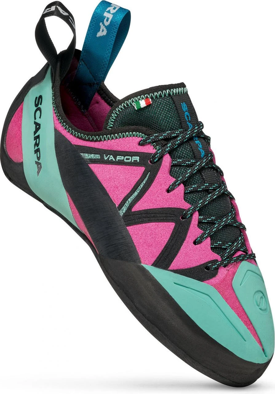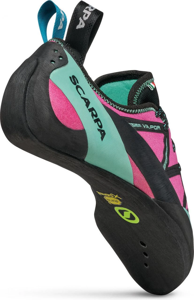 The Vapor Wmn is the perfect all-rounder for sport climbing and multi-pitch climbing. The upper consists of several microfiber cut parts that are sewn together so that the shape fits perfectly to the foot without causing pressure points. The midfoot receives perfect support and edge stability thanks to the Bi-Tension system. The midsole, a full-length Flexan insert, supports the foot when standing small steps and the moderate asymmetrical shape of the shoe as well as the medium downturn and moderate toe box provide perfect power transmission. The full Vibram® XS Edge sole rubber is grippy enough to stand up to friction while providing very good support for the foot muscles, especially in very long routes.